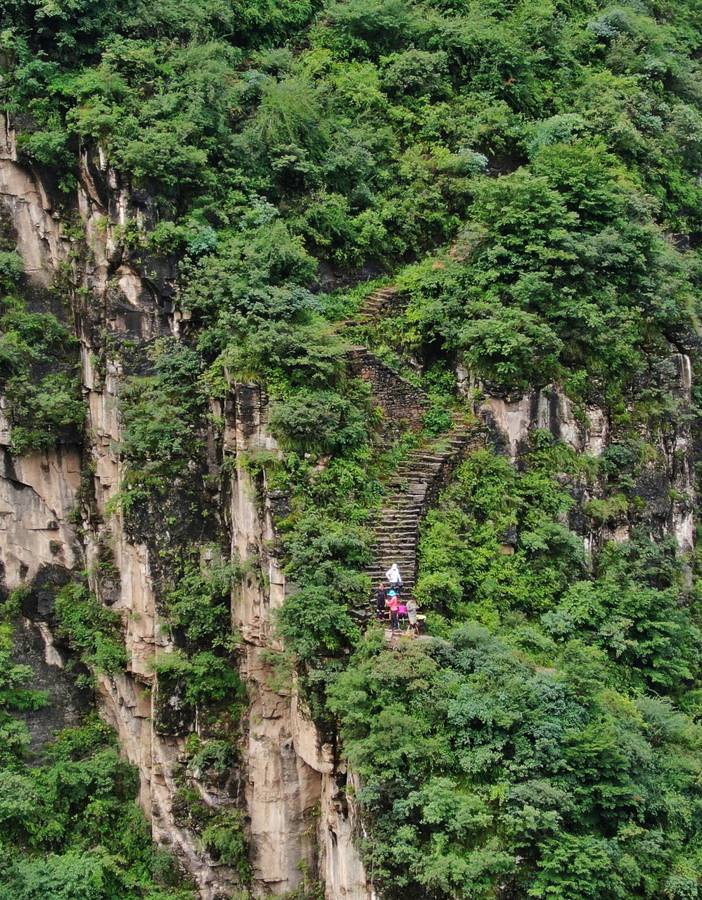 午餐后,穿行在绝壁之上的丛林之中,茂密的树林偶尔打开,瞬间感受到行在云端的感觉。看着悬崖绝壁上的下行小梯,不禁感慨,如此绝壁上竟有这样一条小路,真可谓鬼斧神工!之后抵达【八里沟景区】,入住景区内宾馆。