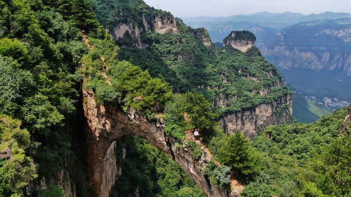 沿着羊肠小道一路行走,便抵达【天生桥】。这是迄今我国北方发现的最大的天然石拱桥。天然石桥飞跨于南北危崖之间,远远望去颇似一座巨大的山门,真乃鬼斧神工、天造地设的世间奇观。站在桥上,天上白云飘动,望之仿佛天旋地转、山倒桥移一般,即便是万里无云的天气,两侧那深不见底的深渊仍然给人以强烈的震憾。