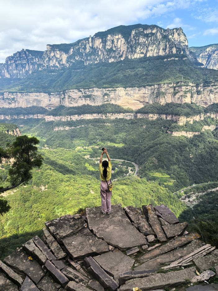之后,我们前往【鲁班豁】徒步入口。远远望去,铁壁铜墙般的太行山被嵌入一个U型豁口,此豁口自古便是豫晋两省来往的主要通道之一。相传是鲁班见村民被大山阻隔,出行不便,抡斧劈山而成的“鲁班豁”。行走在数百年的古道之上,凉风习习,浮云变换,如入仙境,鲁班梯的惊险绝伦让人惊叹不已。登上豁口,左边是一望无际的华北平原,右边是层峦叠嶂的太行山脉,截然不同的景观让人怦然心动。饱览美景之后,徒步下山。